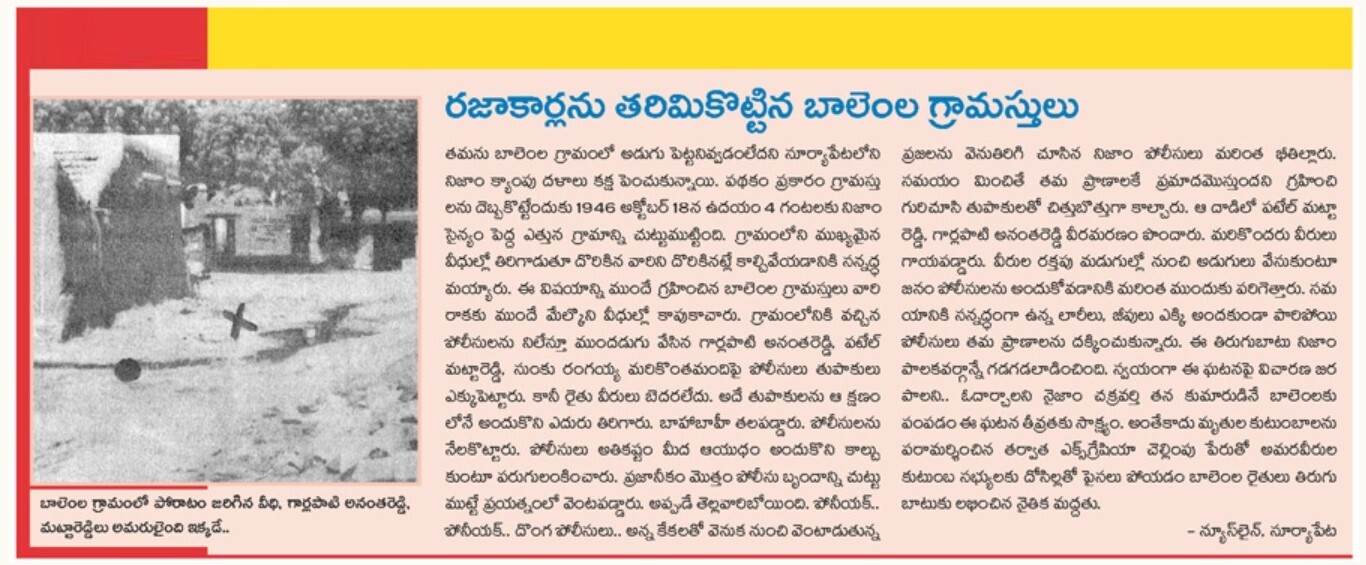 The army of Nizam camp developed hatred towards inmates of Balemla (village) for not providing them any sort of entry. On 18th October 1946 at 4:00 A.M. Rajakars surrounded the village strategically to shoot the main leaders at site by searching into the streets. The inmates of Balemla grasped the mal intention of the Nizam Soldiers and decided to protect themselves and declared high alert among themselve